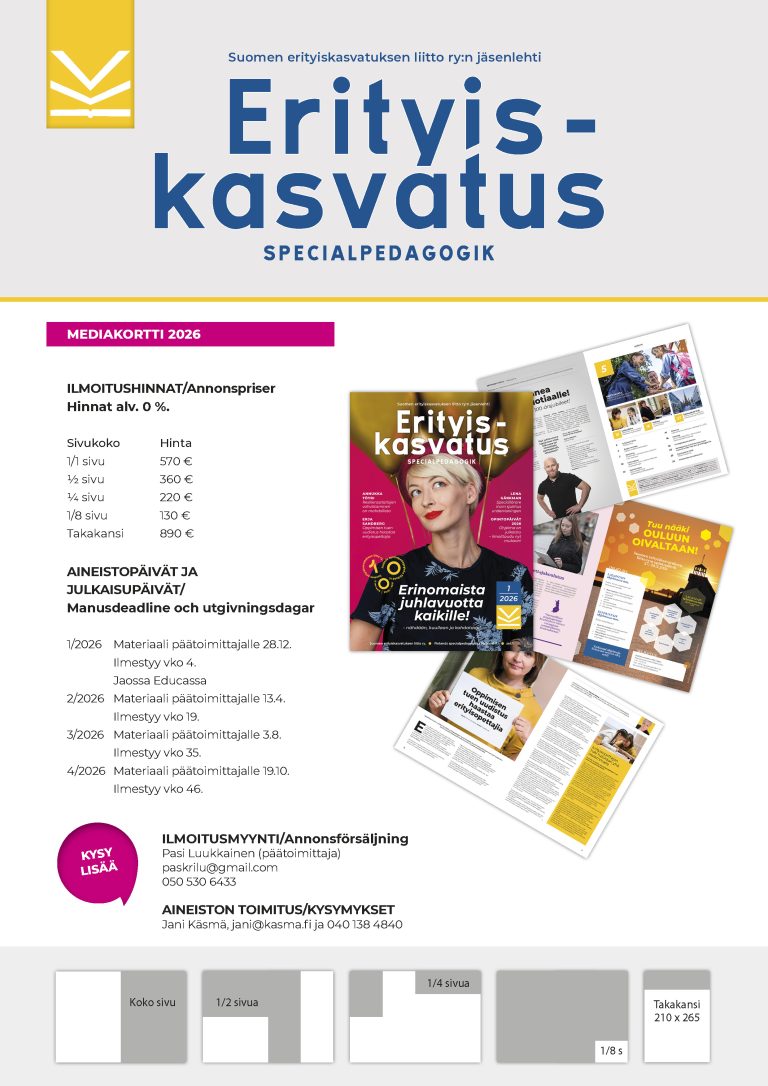Jäsenlehtemme tavoittaa neljä kertaa n. 2 000 lukijaa vuodessa, lehtemme onkin hyvä mainosmedia opettajille. Alla ensi vuoden mediakorttimme. Mediakortti on myös PDF-tiedostona ladattavissa tästä.